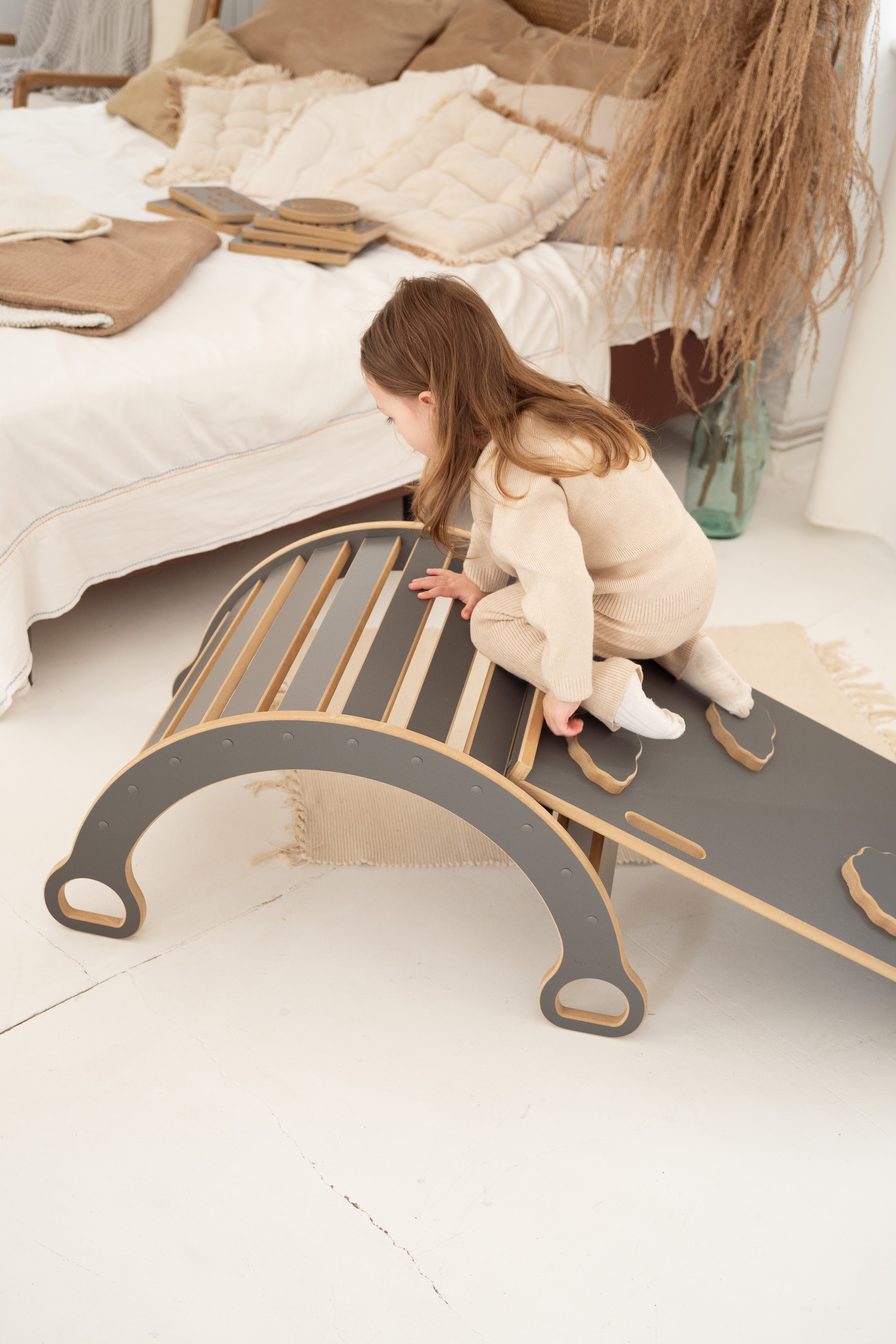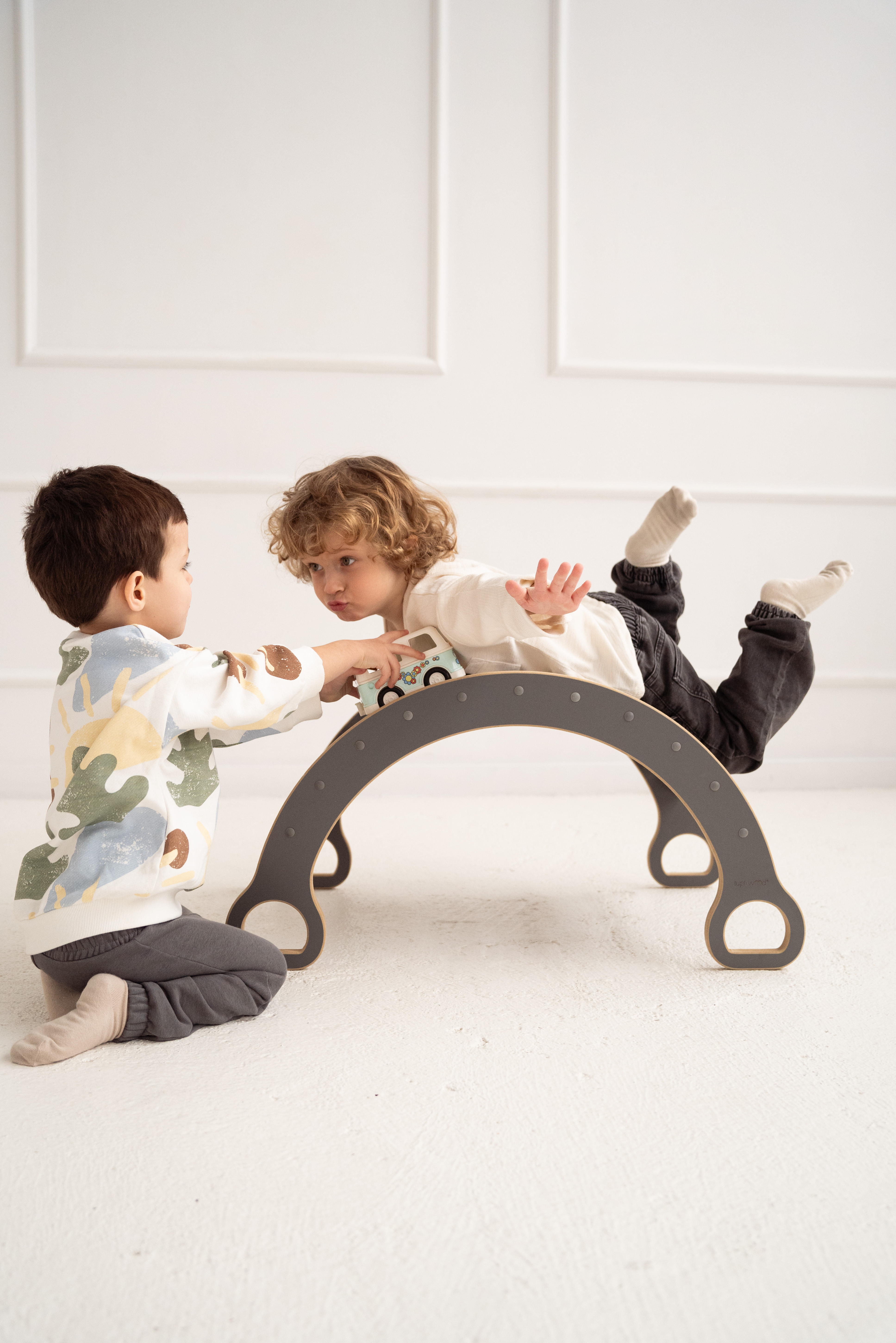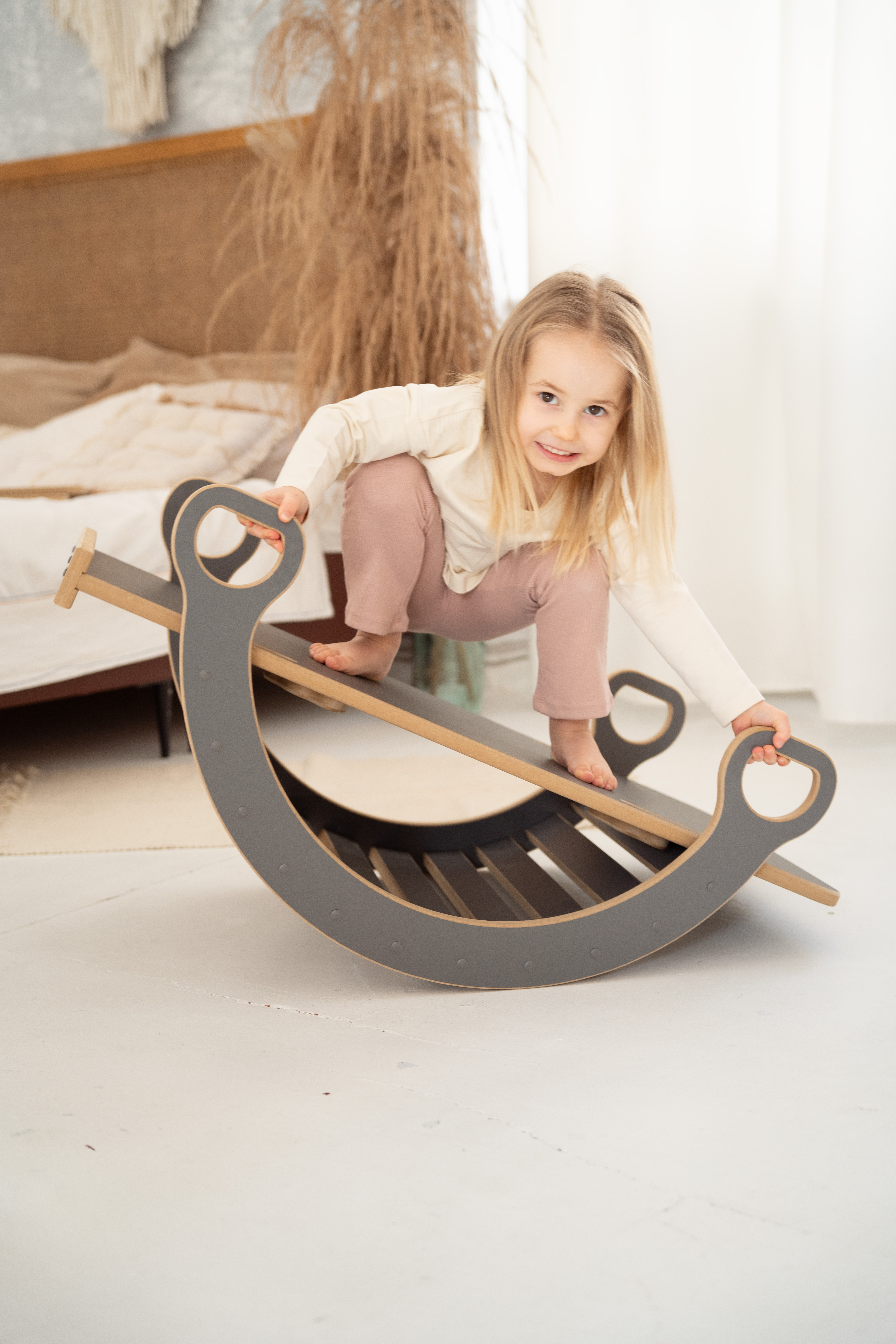 La balancelle est un jouet en bois multifonctionnel inspiré de la pédagogie Montessori, qui durera des années – voire des générations ! Elle offre de nombreuses possibilités d’utilisation, et seule notre imagination nous limite, une ressource dont les enfants ne manquent pas. Jouer avec la balancelle favorise le développement de la motricité globale, de l’équilibre, stimule le sens de la proprioception et la coordination œil-main.