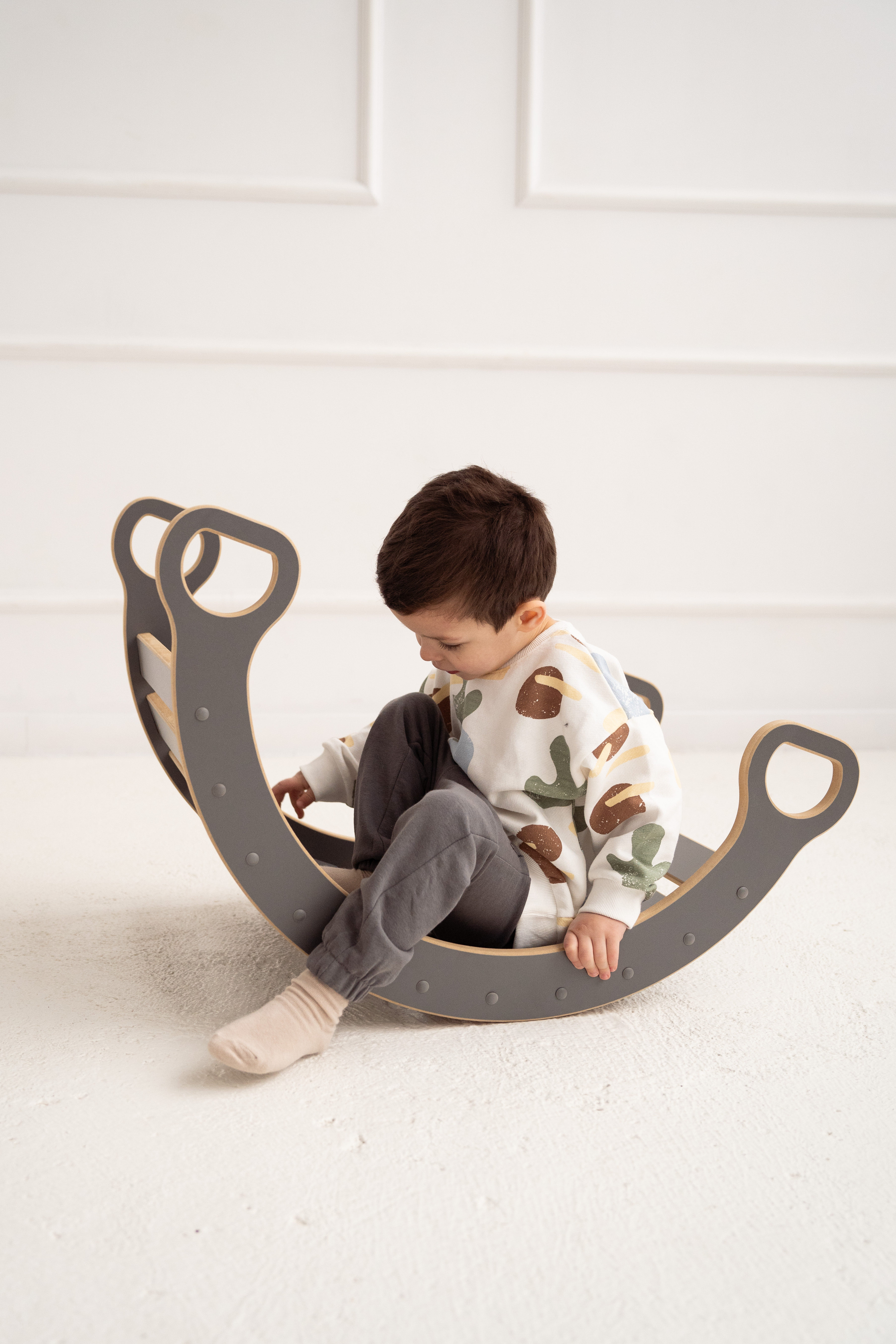 La balancelle peut être utilisée de deux manières. En position bascule, avec les patins tournés vers le haut, elle permet de se détendre et de profiter d’un moment de calme. Le mouvement de balancement est idéal pour apaiser, réduire le stress et se relaxer. Elle peut aussi être retournée – et c’est parti pour l’aventure ! Escalader, construire une cabane, jouer au magasin, organiser des courses de voitures ou créer un tunnel… Cela signifie qu’un seul meuble devient à la fois un espace de repos et de jeu.