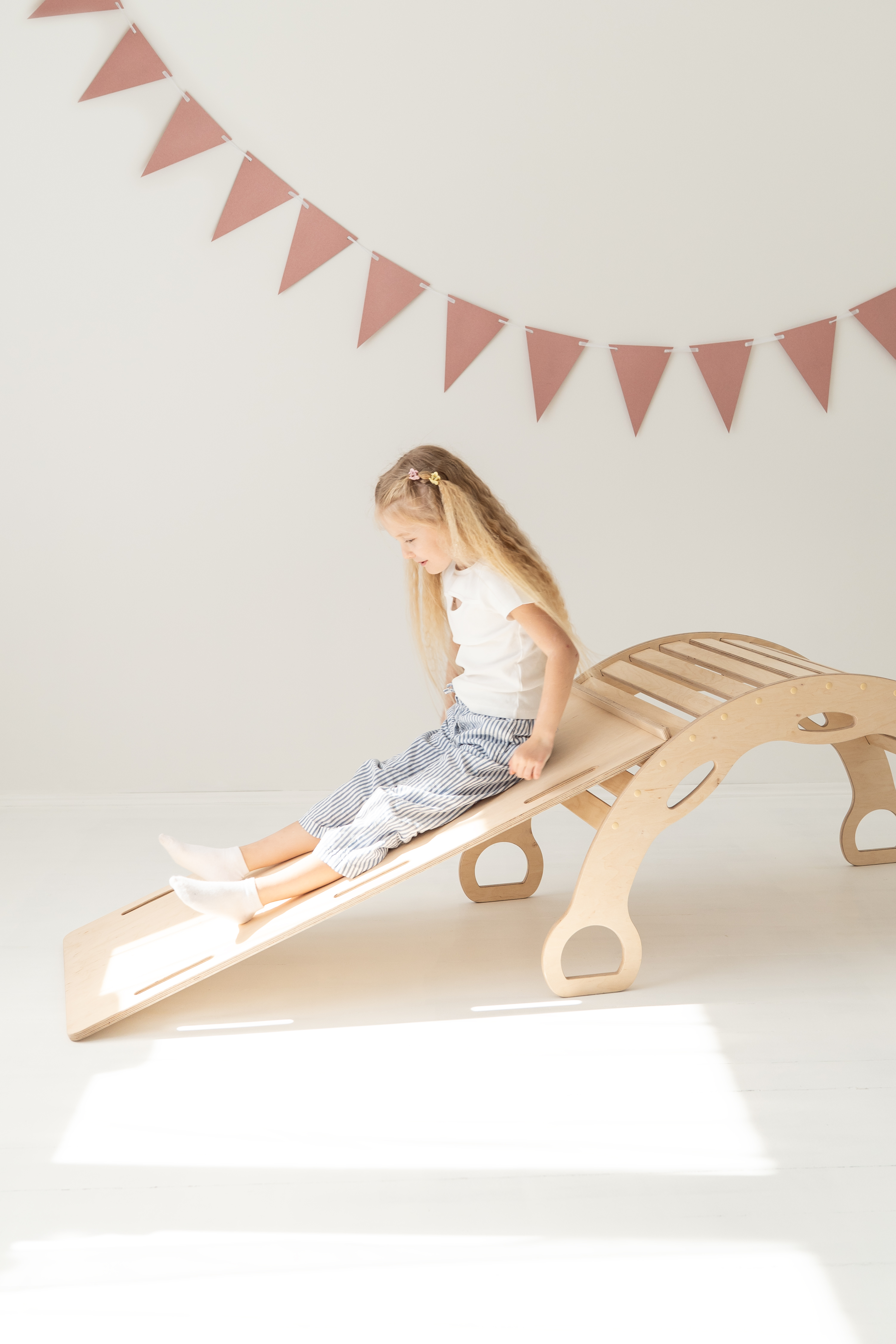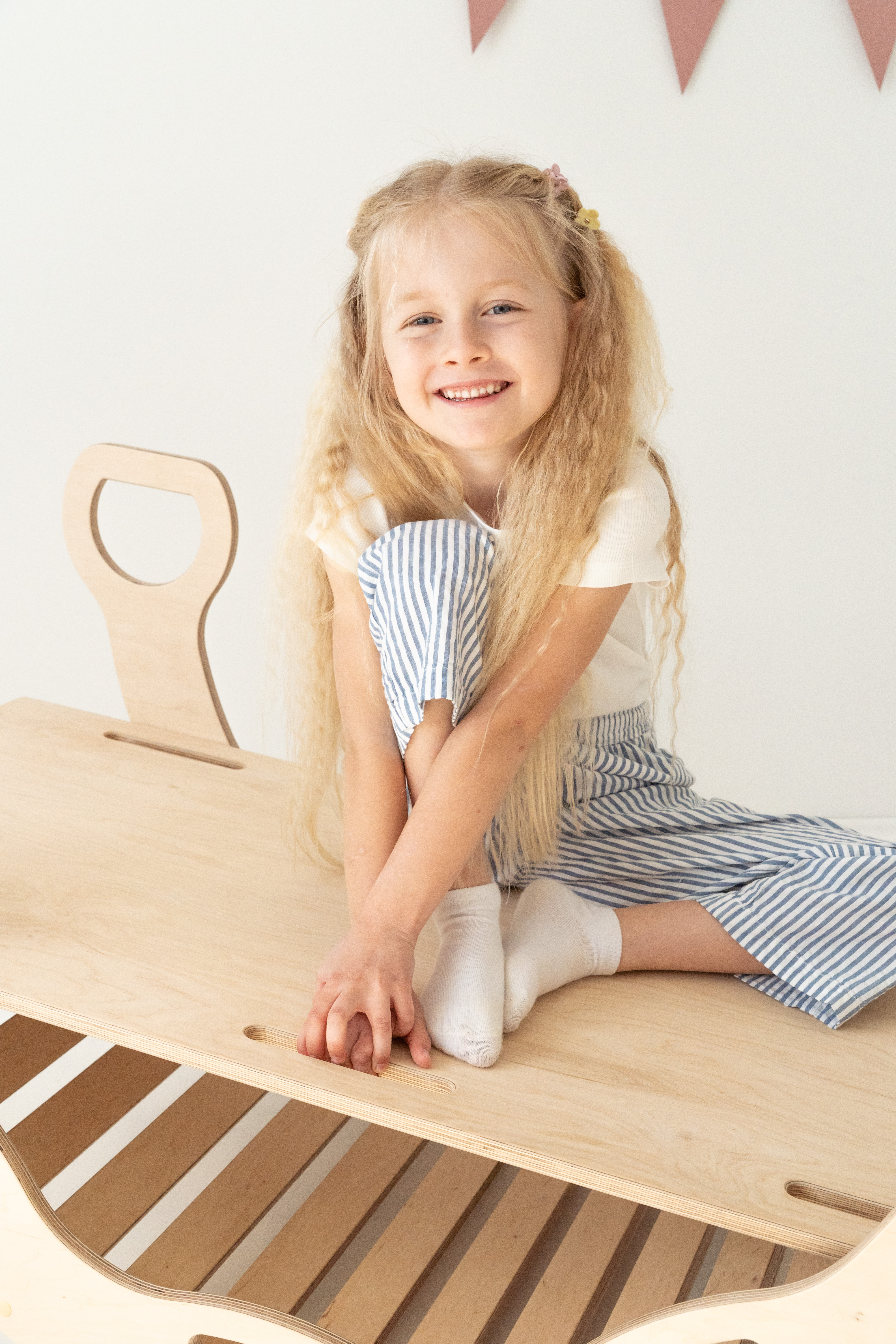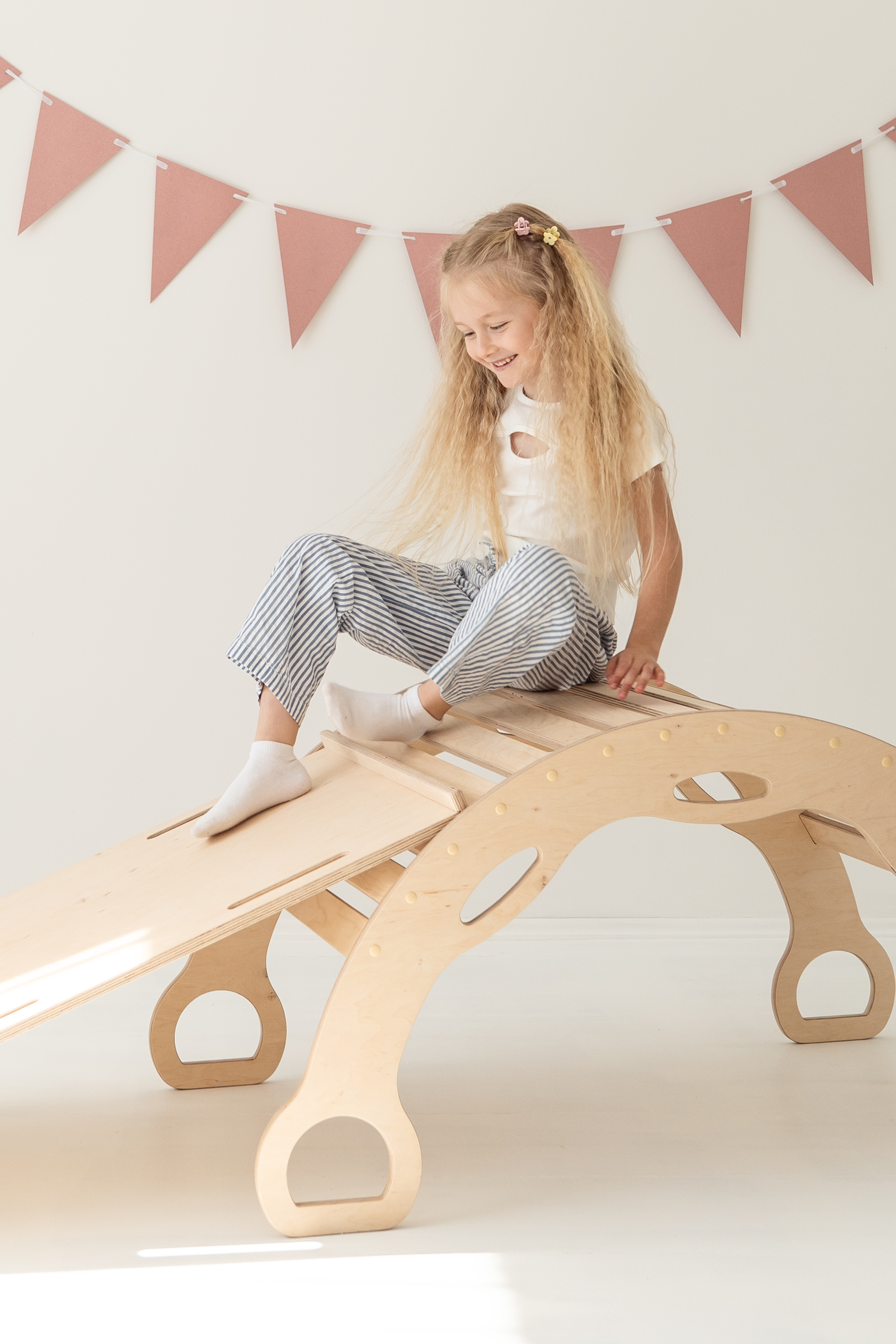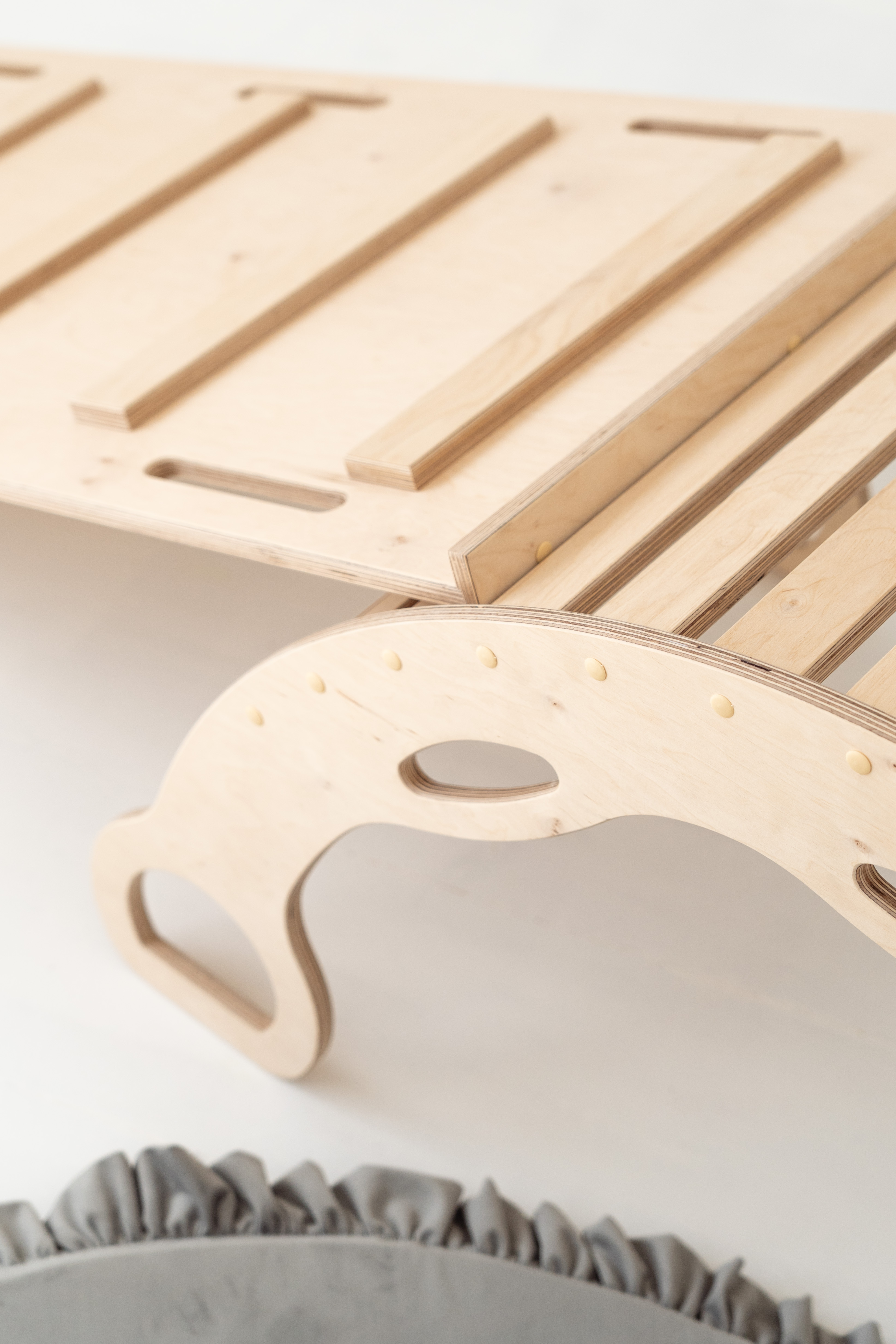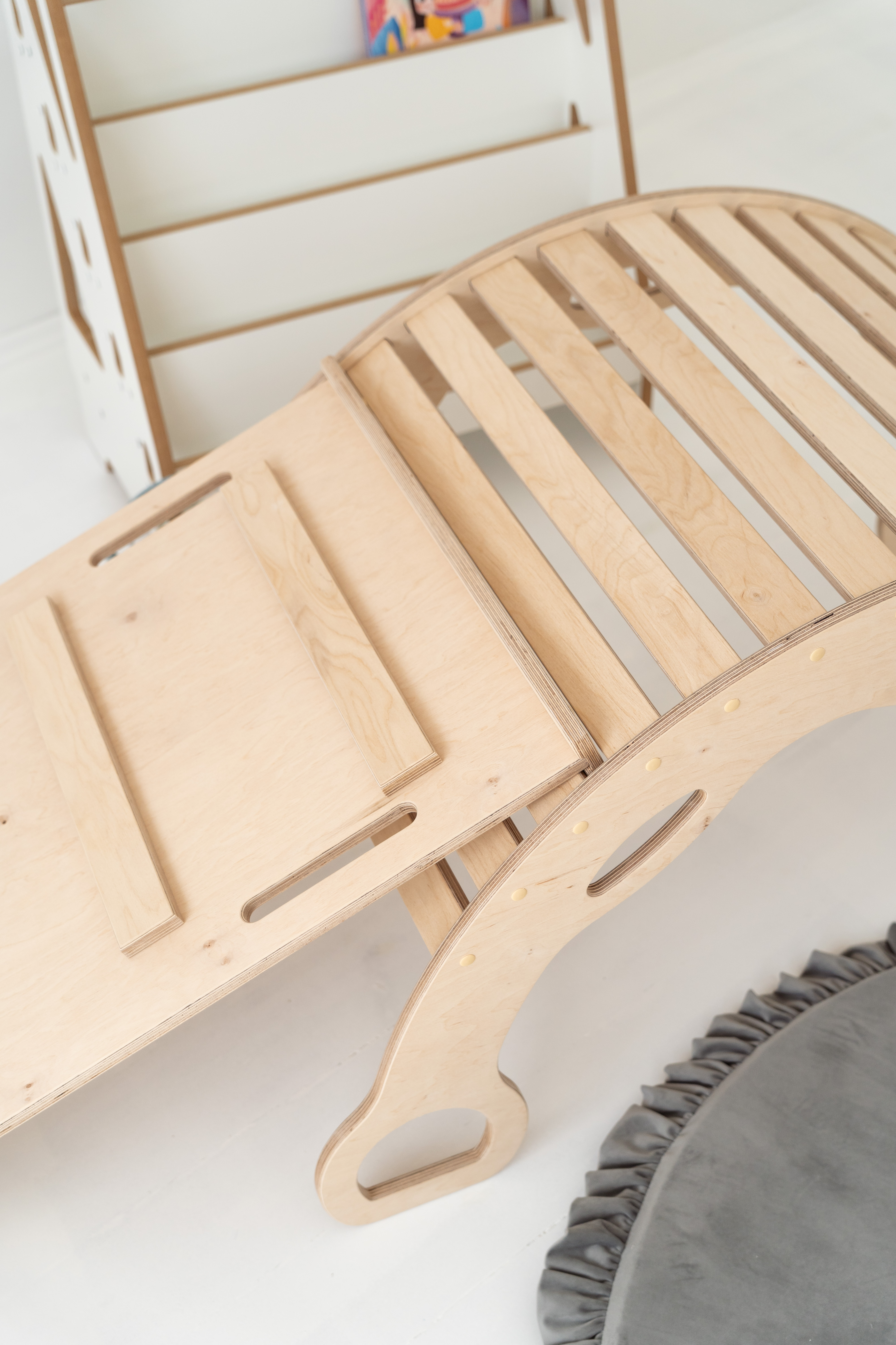 La rampe peut aussi être posée sur le rocking-chair pour créer une planche d’équilibre – à utiliser de préférence pieds nus pour encore plus de sensations.