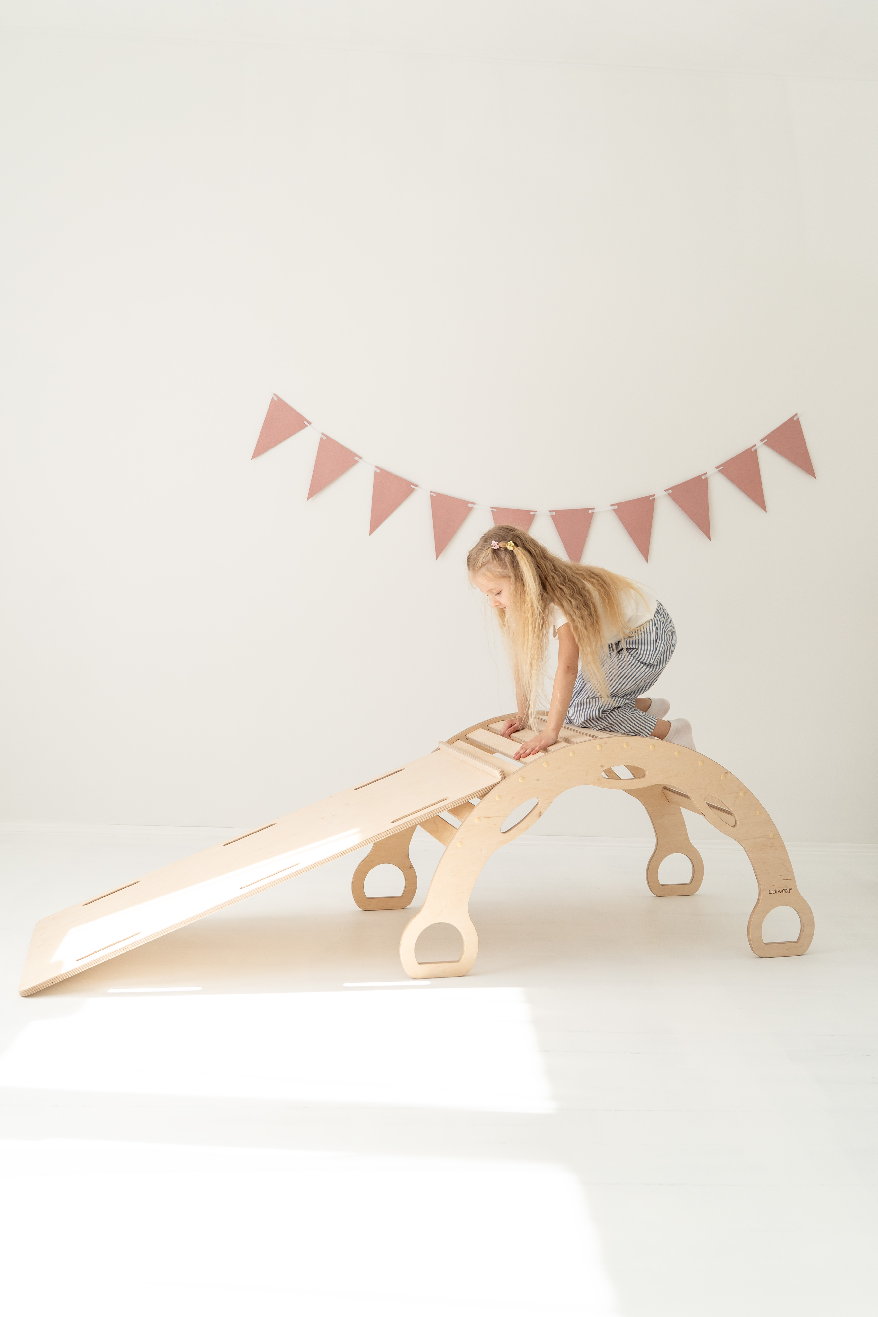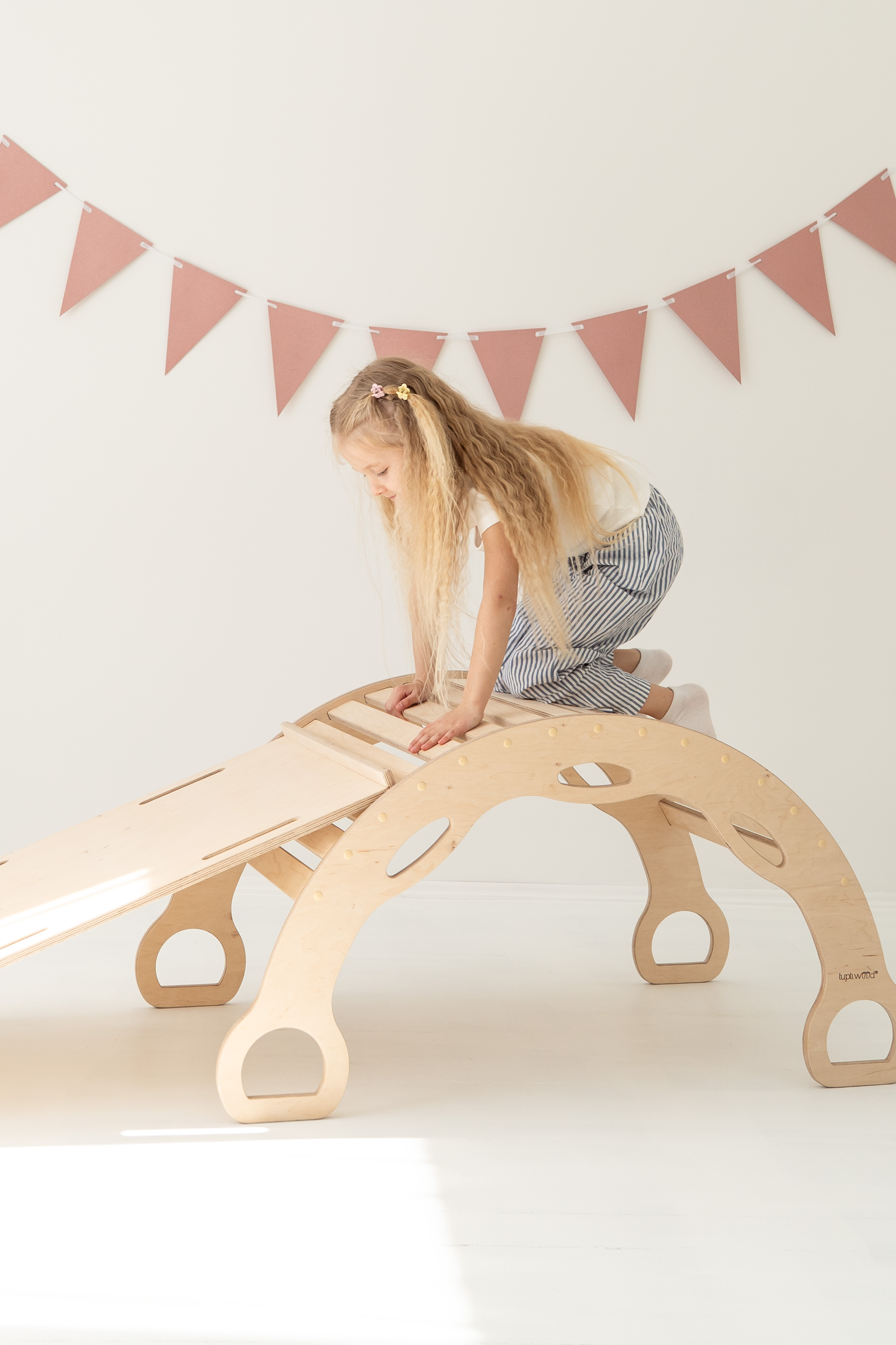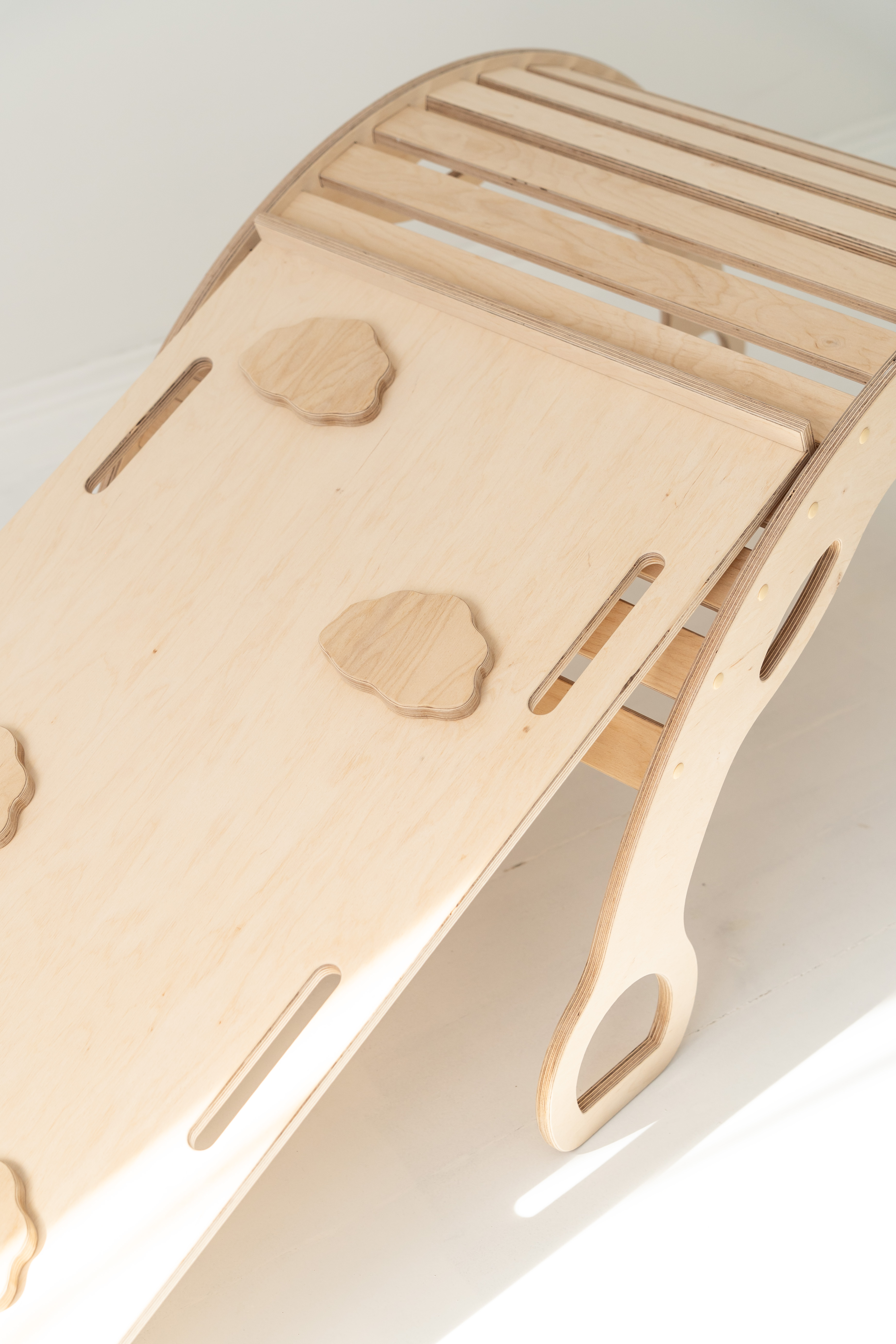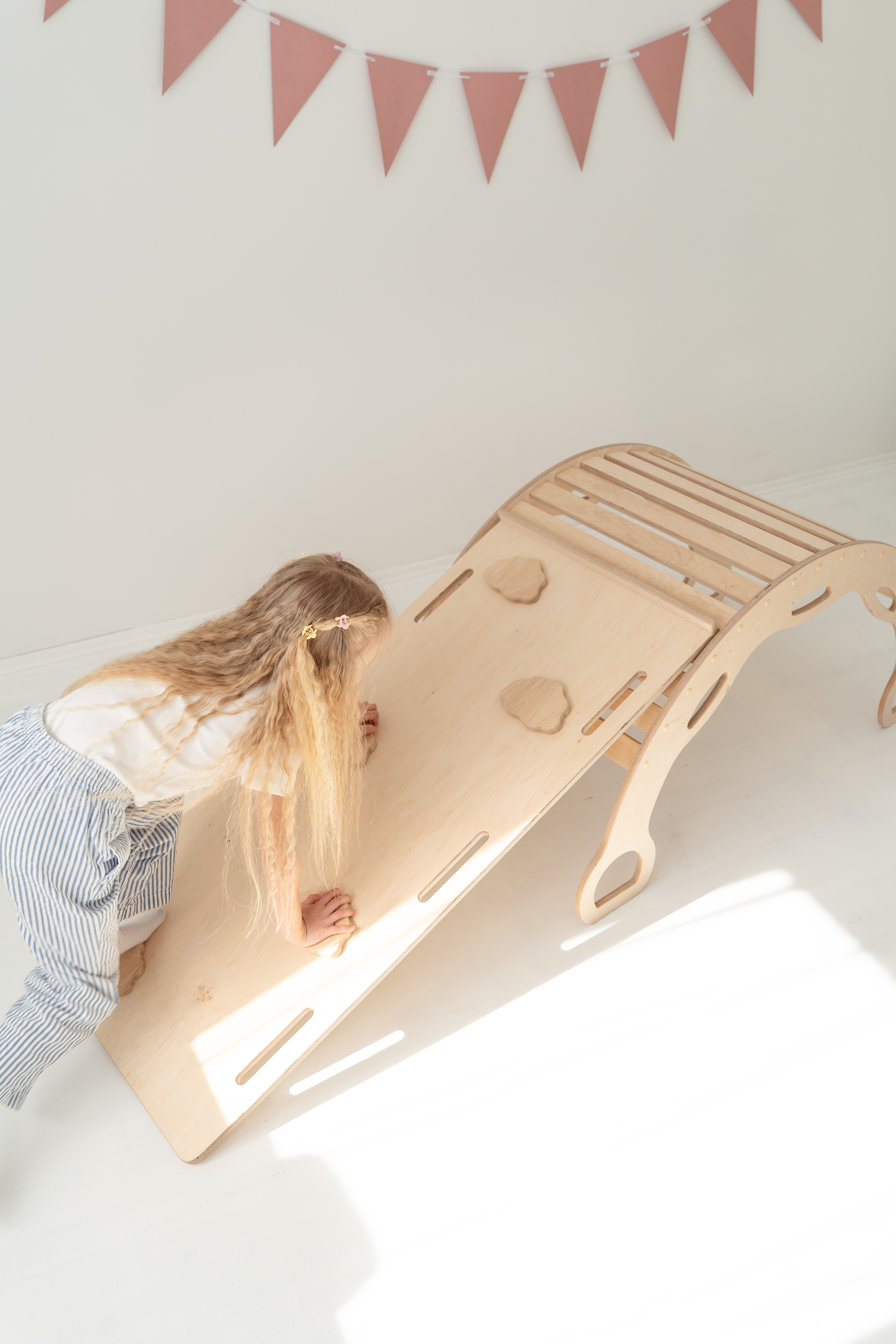 Avec la rampe d’escalade/toboggan 2-en-1 – un côté toboggan, l’autre mur d’escalade avec protection. La planche peut également être posée sur le rocking-chair pour créer une planche d’équilibre.