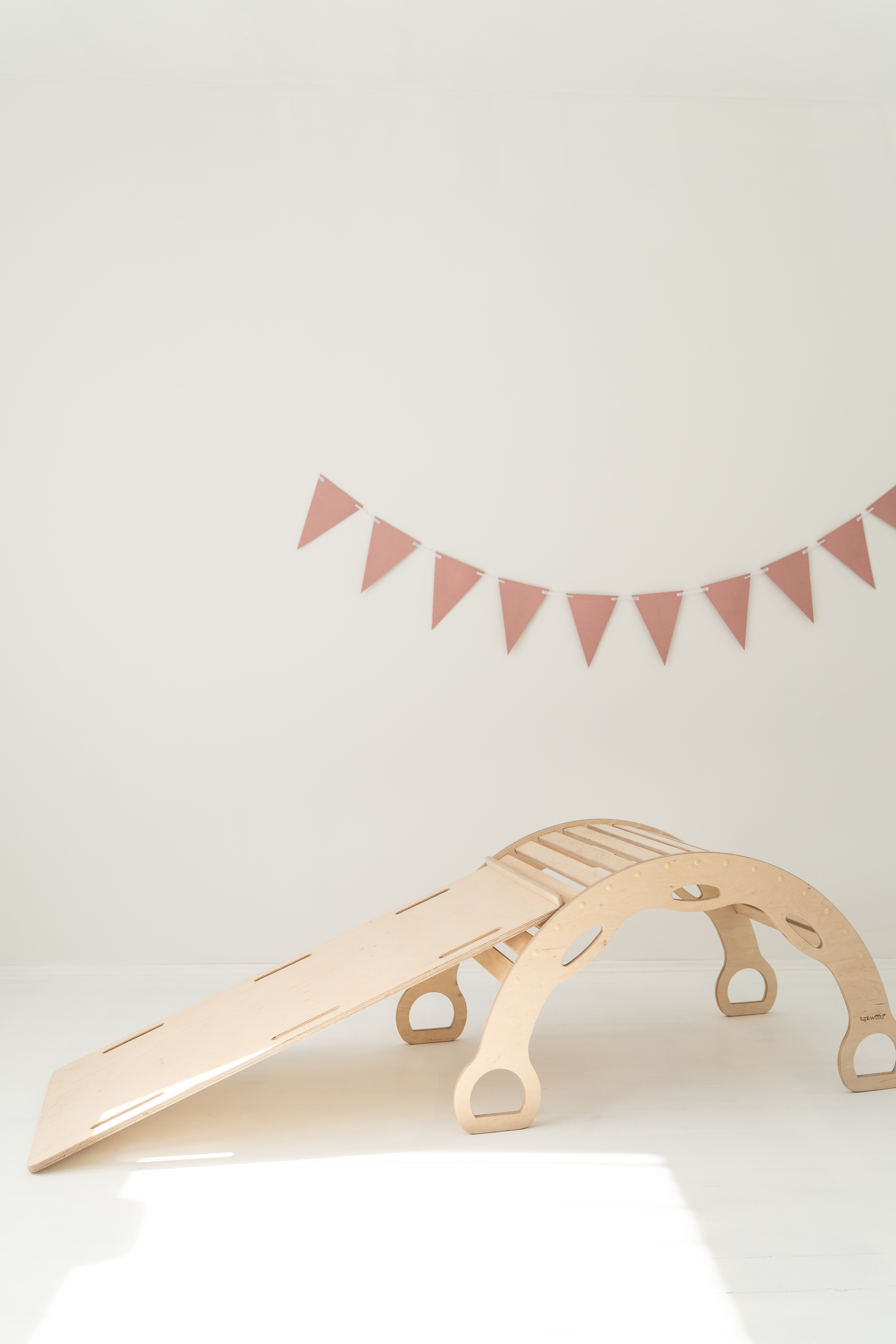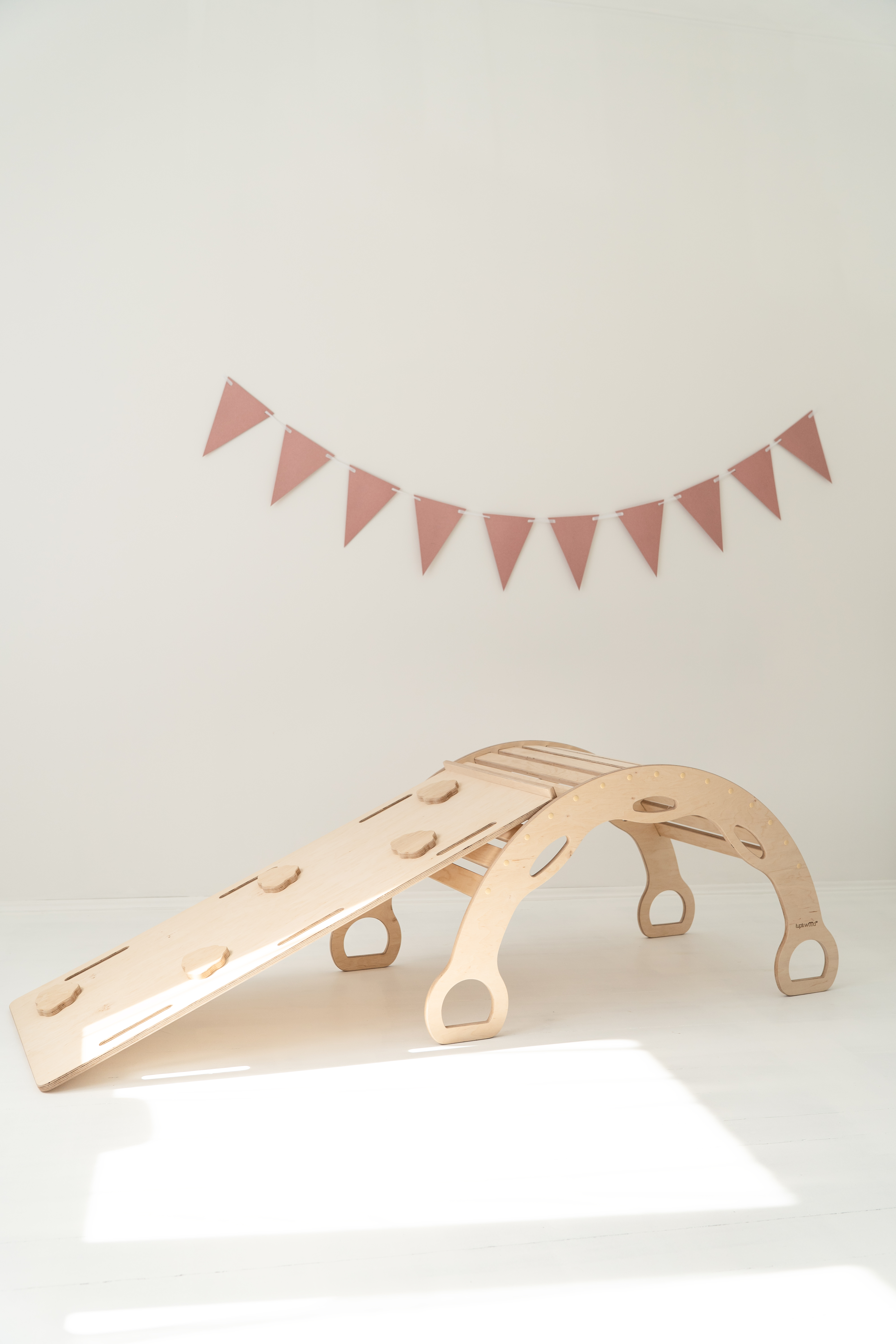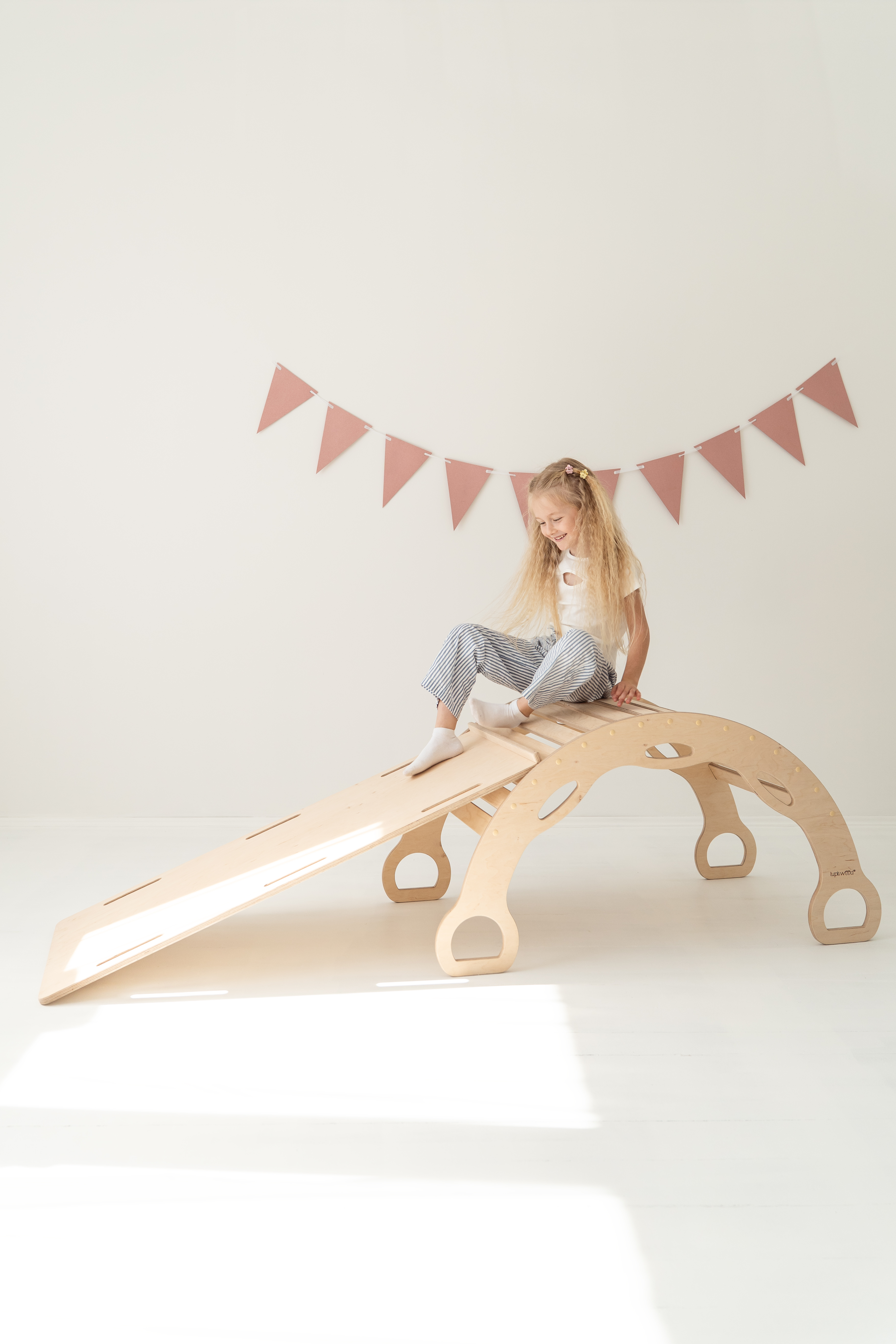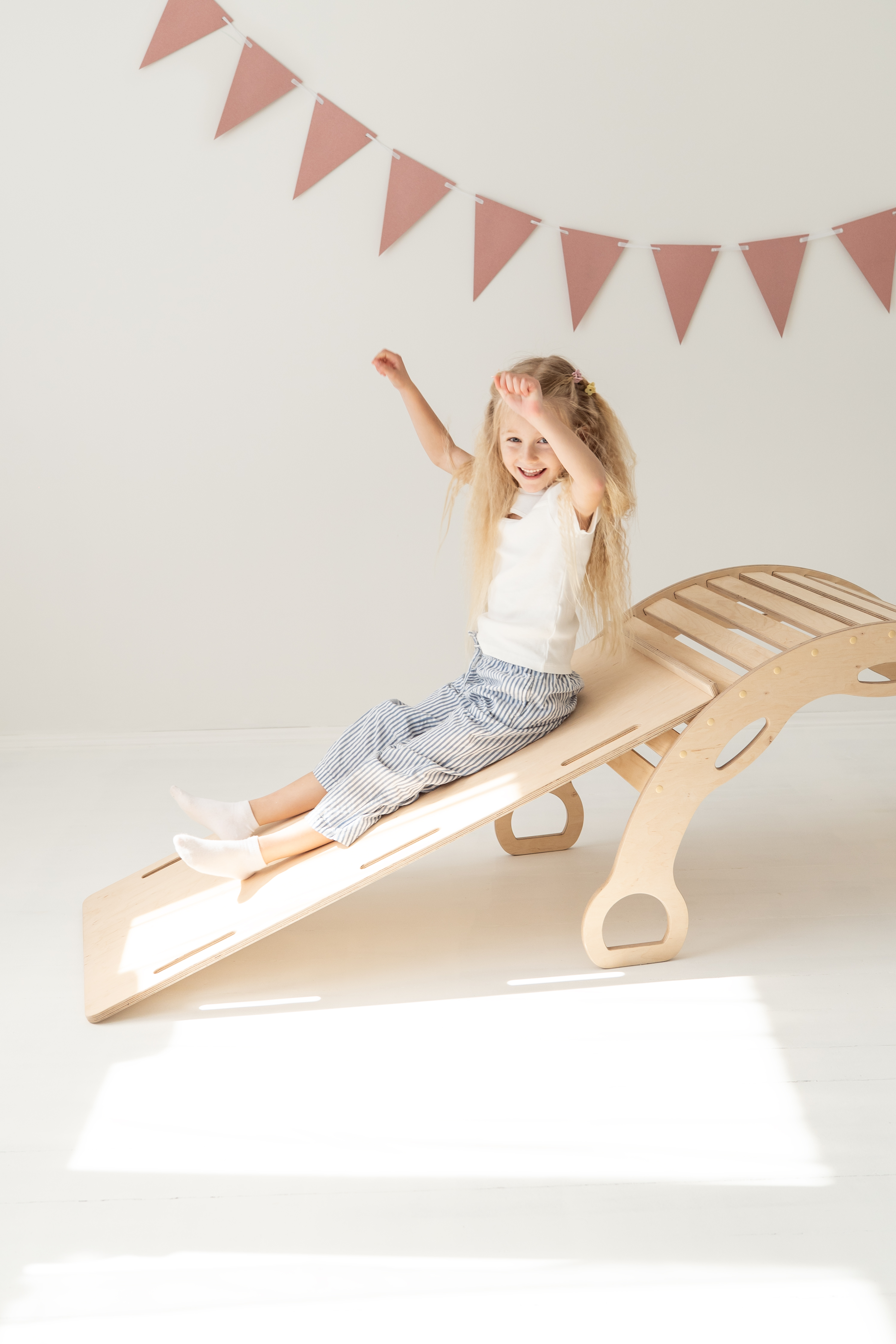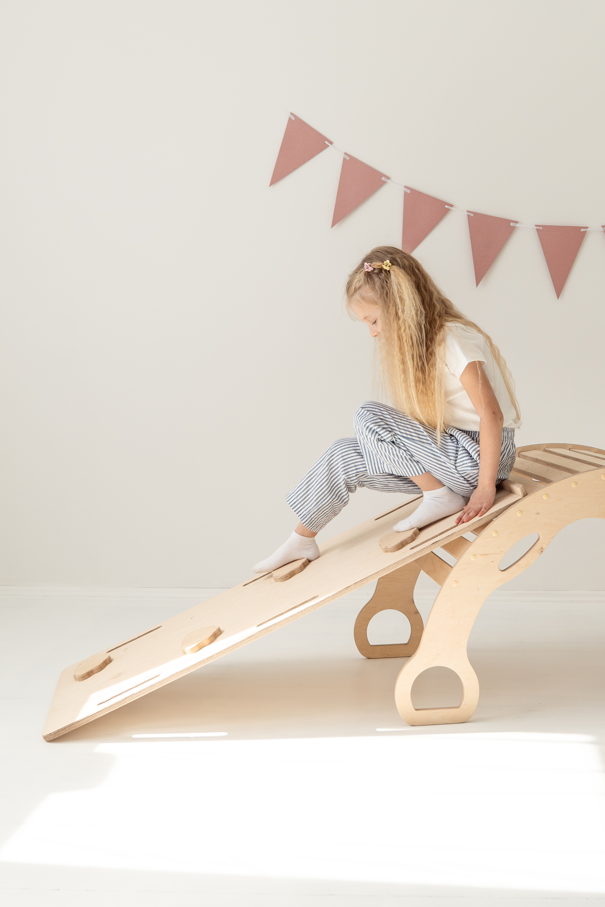 Avec la rampe d’escalade/toboggan 2-en-1 – un côté toboggan, l’autre mur d’escalade avec protection. La planche peut également être posée sur le rocking-chair pour créer une planche d’équilibre.
